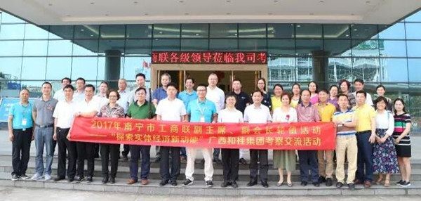 市政協(xié)副主席、工商聯(lián)主席黎四龍,市委統(tǒng)戰(zhàn)部副部長、工商聯(lián)書記李忠南,南寧市工商聯(lián)(商會)領導 、南寧市工商聯(lián)第十四屆執(zhí)委會常委、特邀商會和企業(yè)代表,以及市委統(tǒng)戰(zhàn)部、工商聯(lián)有關部室負責人、經(jīng)開區(qū)黨工委管委會書記覃傳財?shù)?9人參加考察調(diào)研活動。剛剛在5月18日召開的南寧市工商聯(lián)第十四次代表大會上,當選為南寧市工商聯(lián)副主席的我集團公司總裁黃偉文攜公司相關部門負責人熱情迎接并陪同考察。