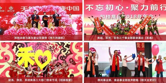 和桂集團本部及源生堂來來的開場舞《偉大旗幟》氣勢恢宏,源生堂人抱著堅定的信心,凝聚磅礴的力量,一起迎接養(yǎng)發(fā)新時代;財務+系統(tǒng)+物流帶來的舞蹈《相親相愛》展現(xiàn)了和桂大家庭的和諧與溫情??乒鹕坛?百貨+百色舞蹈《軍魂》,跳出了和桂人鋼鐵般堅韌的軍人意志力和軍魂。怡桂+食品《明天會更好》表達了全體員工“共創(chuàng)和桂輝煌明天”的美好愿望。