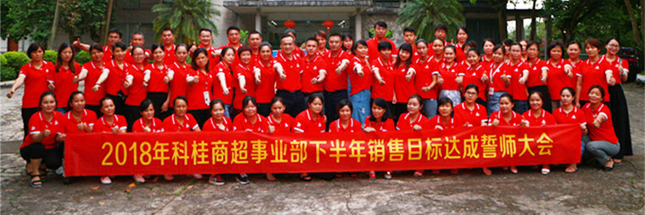 “市場就是戰(zhàn)場,戰(zhàn)火已經(jīng)點(diǎn)燃,我堅(jiān)信,努力工作是本分,業(yè)績才是硬道理,為奪取下半年的任務(wù),我宣誓:我將率領(lǐng)我的團(tuán)隊(duì),勇往超前,全力以赴,保證完成公司下達(dá)的任務(wù)”。隨著最后分片區(qū)團(tuán)隊(duì)的宣誓聲在一次一次的響起,2018年7月7日-2018年7月8日,科桂公司商超事業(yè)部下半年銷售目標(biāo)達(dá)成誓師大會,在南寧大王灘完美落幕。