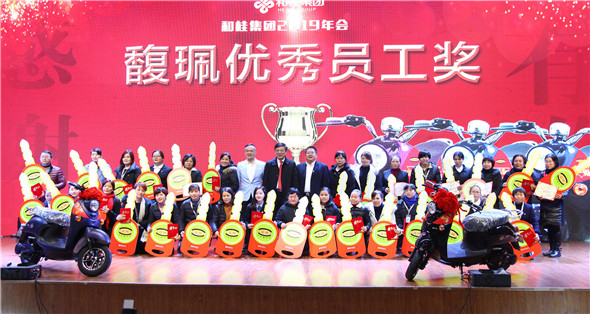 (廣東雅娜集團有限公司總裁呂在坤和集團常委頒發(fā)年度“馥珮”優(yōu)秀員工獎,每人一輛電動車)