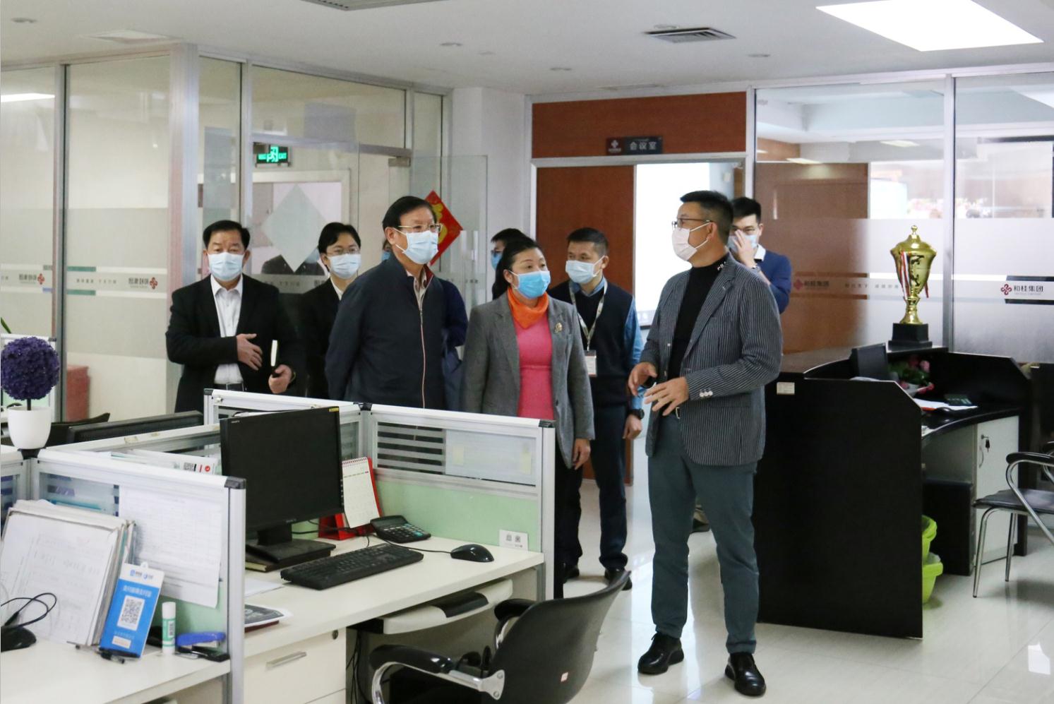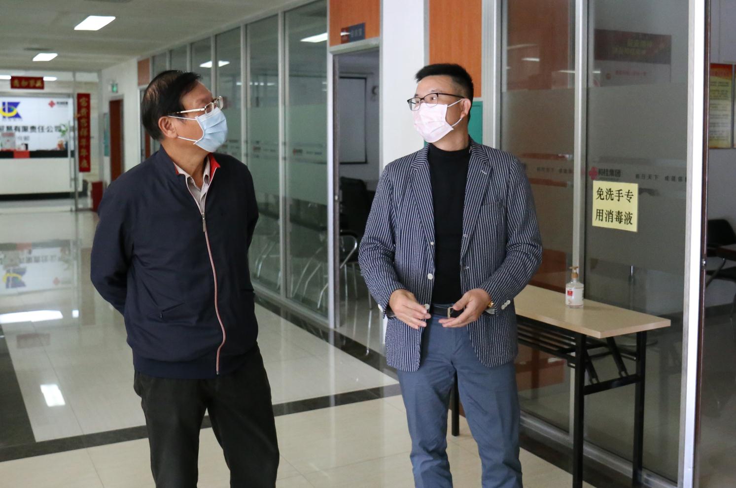 陳世平主席一行在黃總的帶領(lǐng)下,首先巡視了和桂集團(tuán)各分子公司辦公區(qū),查看員工到崗及企業(yè)疫情防控落實(shí)情況。黃總表示,為了響應(yīng)國(guó)家號(hào)召,安全復(fù)工復(fù)產(chǎn),公司作了周密部署,加強(qiáng)園區(qū)防控演習(xí);制訂了《復(fù)工管理規(guī)定》、《和桂集團(tuán)公共場(chǎng)所文明防疫六條公約》、《和桂集團(tuán)入園全流程防護(hù)指南》等制度。園區(qū)執(zhí)行封閉式管理,人員進(jìn)出須佩戴口罩、測(cè)量體溫并登記;全公司區(qū)域每日進(jìn)行消毒衛(wèi)控;為員工配發(fā)口罩、在辦公區(qū)擺放免洗手消毒用品,確保員工安全;實(shí)行員工分批錯(cuò)峰就餐制等措施,全力確保員工安全、生產(chǎn)安全。